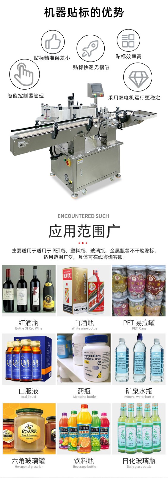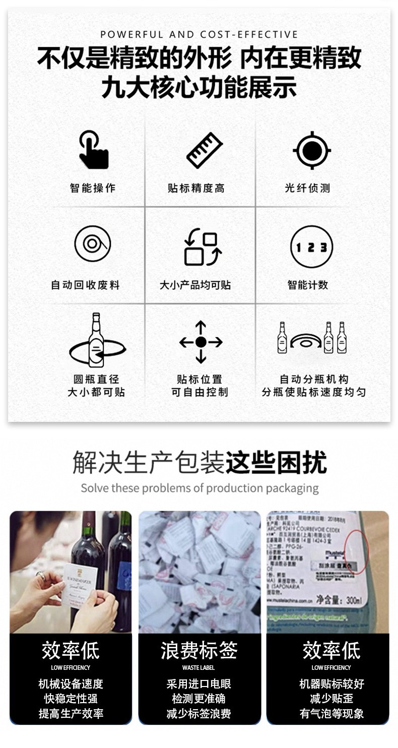 圓瓶定位貼標機的核心優勢是精準度高、適配性強、自動化程度高,其效率則體現在穩定的貼標速度和低故障率上,能顯著降低人工成本并提升包裝一致性。