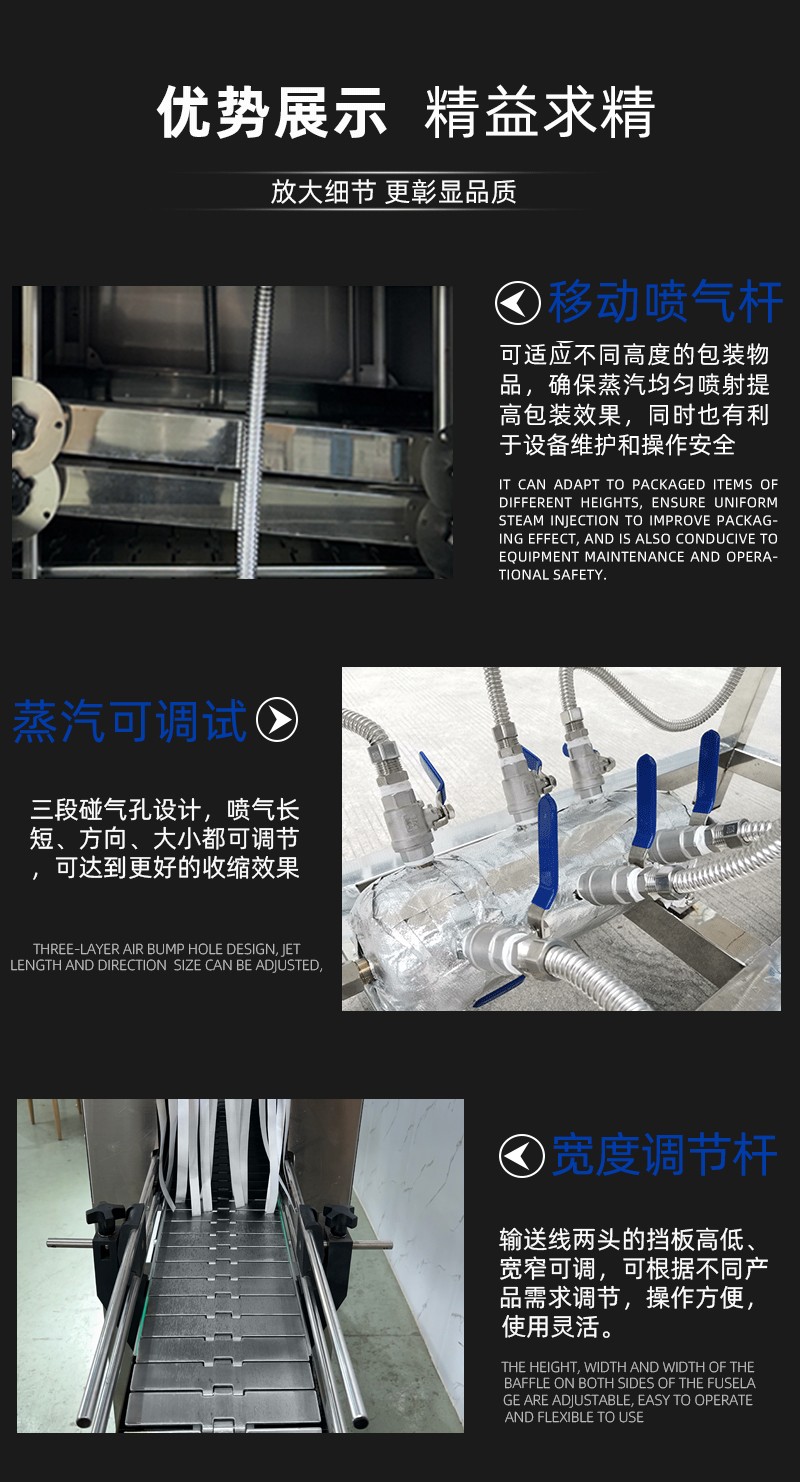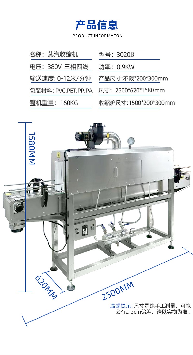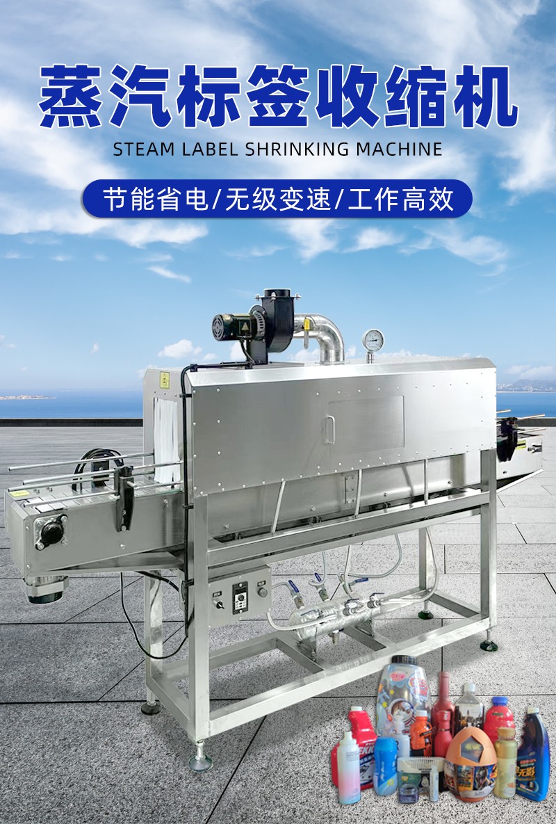 蒸汽收縮機是一種利用高溫蒸汽對包裝材料進行加熱收縮的設備。將水轉化為高溫蒸汽,蒸汽經管道輸送至收縮通道。產品包裹熱收縮膜后進入收縮通道,蒸汽均勻噴射在膜表面,使膜材遇熱迅速收縮,緊貼產品表面,離開蒸汽區(qū)域后,膜材自然冷卻或經冷風系統(tǒng)快速定型,形成緊湊包裝。