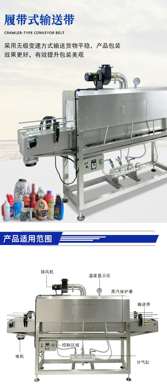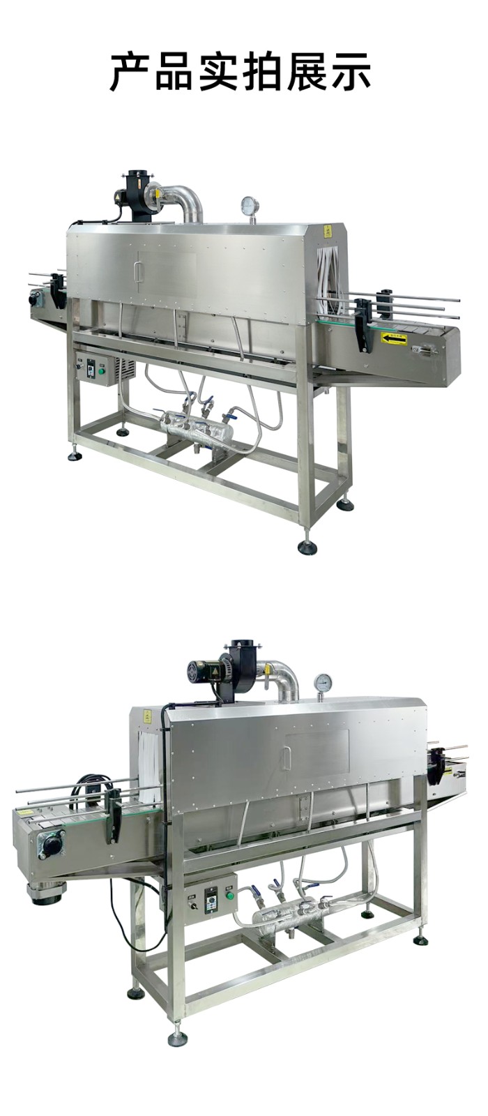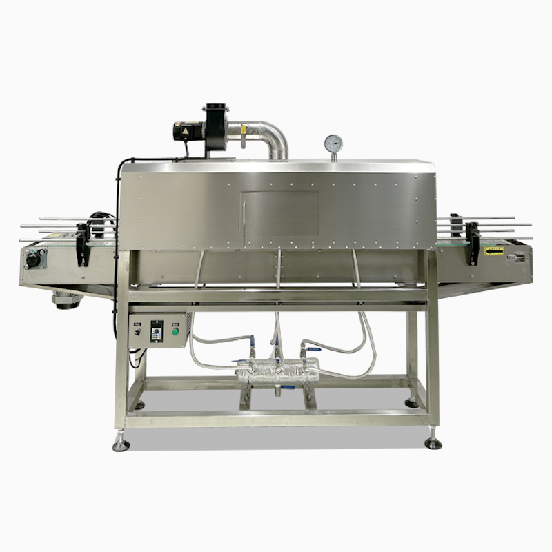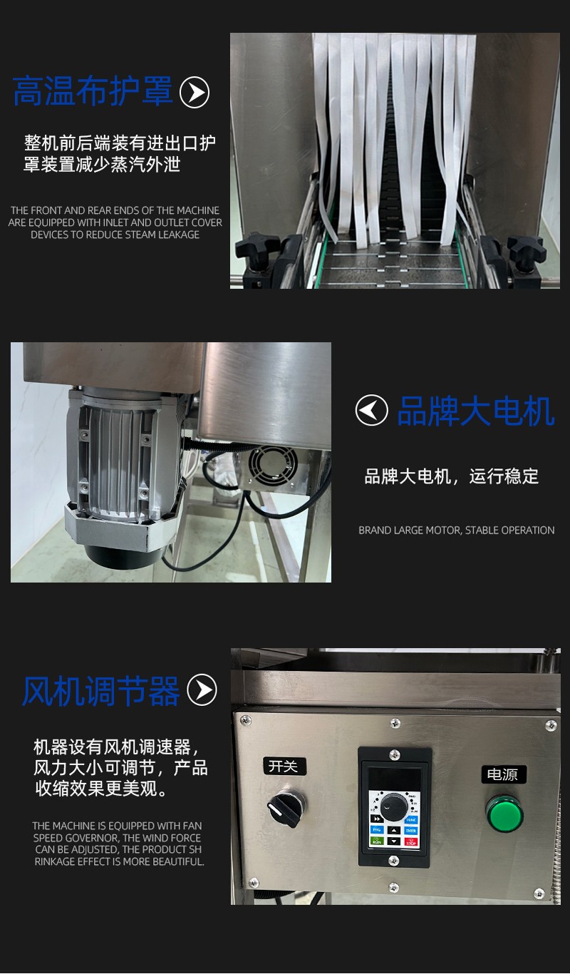 蒸汽收縮機是一種利用高溫蒸汽對包裝材料進行加熱收縮的設備。將水轉化為高溫蒸汽,蒸汽經管道輸送至收縮通道。產品包裹熱收縮膜后進入收縮通道,蒸汽均勻噴射在膜表面,使膜材遇熱迅速收縮,緊貼產品表面,離開蒸汽區(qū)域后,膜材自然冷卻或經冷風系統(tǒng)快速定型,形成緊湊包裝。